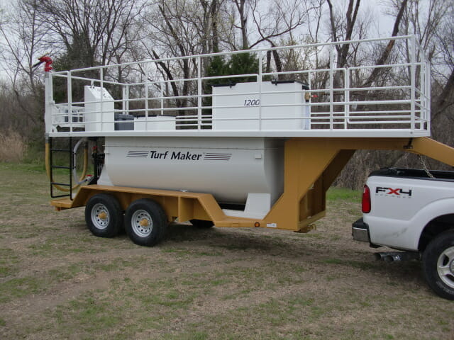 The TurfMaker® 1200 hydroseeder is ideal for Sod Quality Results™ applications. A quality minded contractor can apply wood fiber mulch at heavy rates, along with premium seed, tackifiers, fertilizer, and cover up to 7,500 - 10,000 sq ft. with a tank load. Jobs requiring near perfect results are made with hose applications and usually take about 45 minutes per tank load.